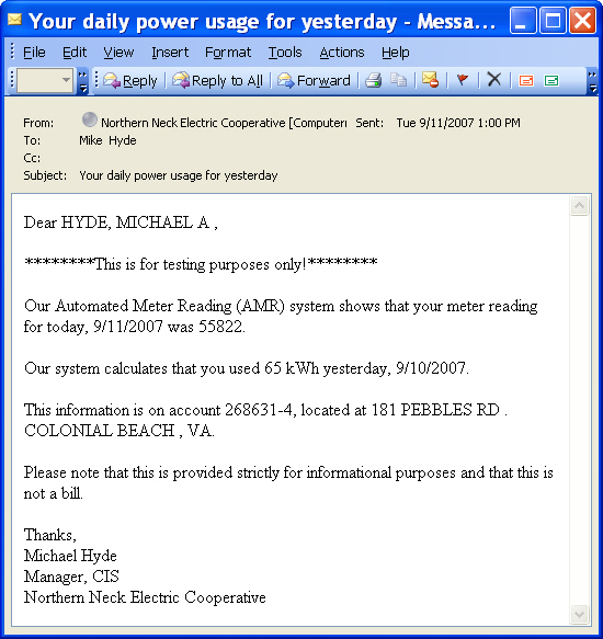 | Daily Member Usage Alert | No | Yes | No | Daily 1300 | An email, sent to members, showing them their usage for the previous day, the hi and low temperatures for that day, and a dollar cost of that usage. |