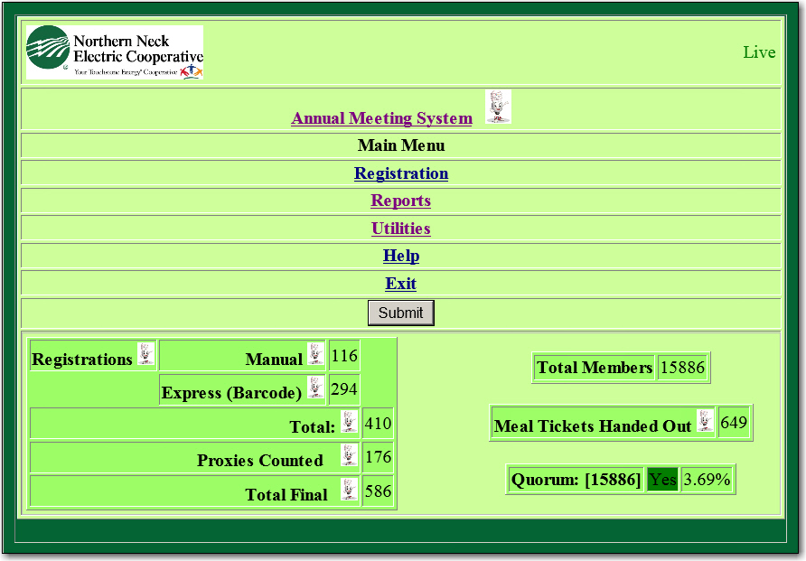 I decided to create a web based system to process the registrations, using iPhones and iPads. We ordered some bluetooth scanners to facilitate scanning barcoded bills. In anticipation of this, I had our bill print vendor add the account & Sub-account number to our members bills. When the barcode scanners came, they appeared a little cumbersome, so we then found the "iCody" app, which uses the internal camera as a barcode scanner and inputs the scan into a web form. It is perfect!