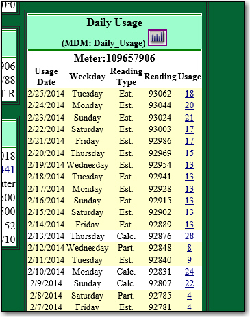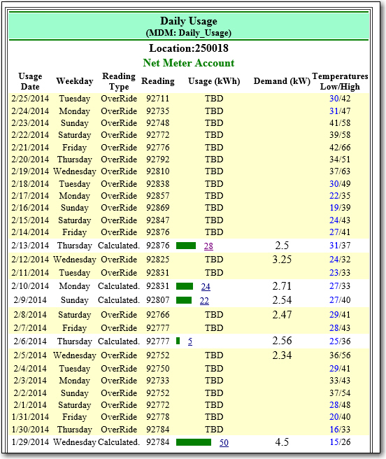 Clicking on the graph icon brings up a more detailed usage graph, that includes weather data, and checks for net metering. Net metering is not calculated correctly inthe current versionof our MDM.