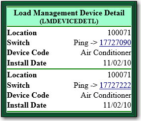 Any water heater or Air Conditioner load management switches are displayed. If they are TWACS devices, a link to ping them is displayed.