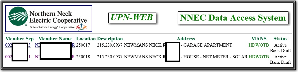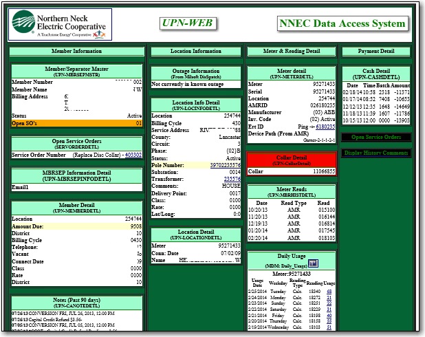 This is member data displayed, in a simple, one screen layout. This screen is displayiong data pulled from the SEDC UPN, SEDC MDM, Milsoft OMS, Aclara TWACS system, and also dfrom teh Daffrom CIS system.