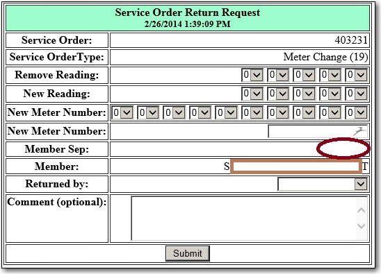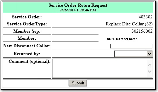If someone wants to request that the SO be returned, they can click, or touch on "Request Service Order Return." The fields populated are dependent upon the type of service order. Some samples are shown below: