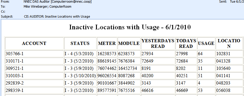 This report show all locations that are set as inactive in the CIS, but had usage the previous day. This report helps find tampers, SO's that may have gotten "Misplaced." |