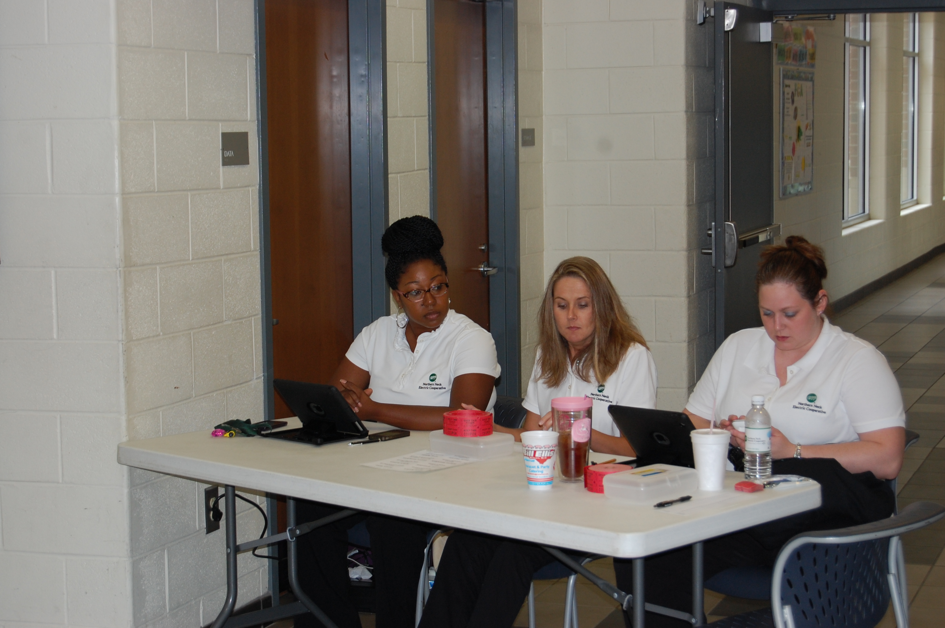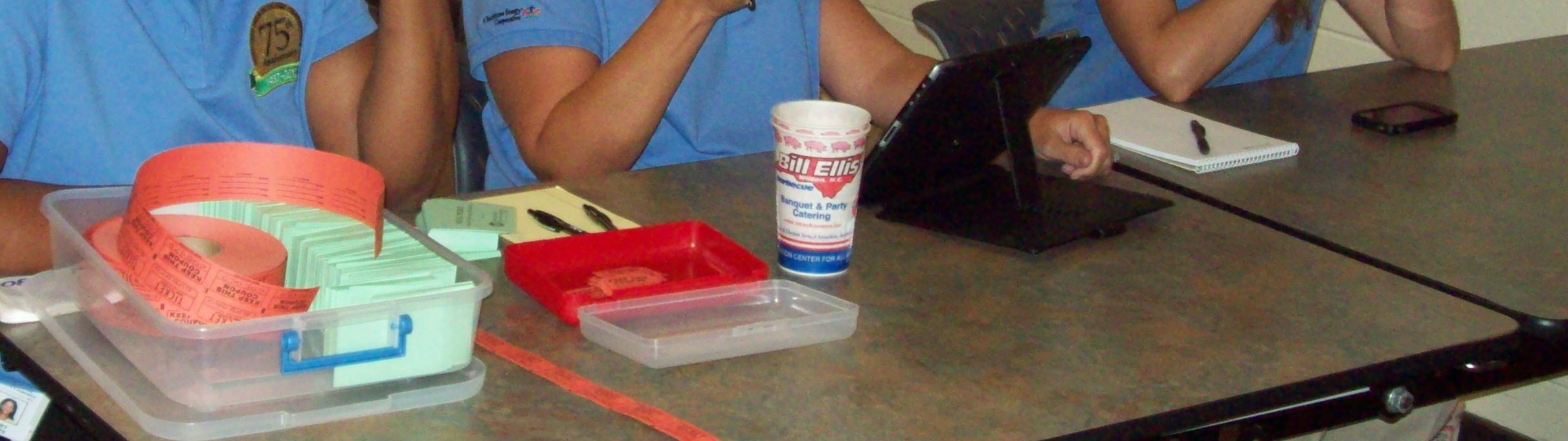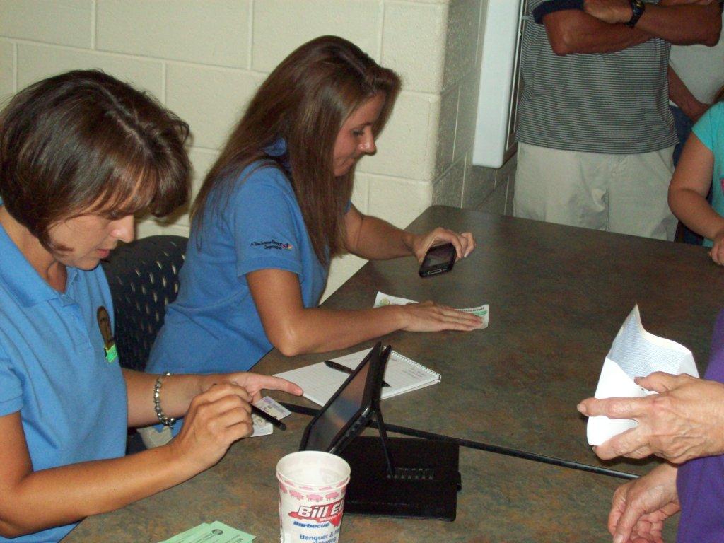 Here is the registration table at our 2012 meeting. We had 2 tables, with 3 people at each table. One person used the iPhone to scan the barcodes on the bill. Another person had the iPad to look up and register any member that did not bring their bill. The last person handed out the meal and prize tickets.