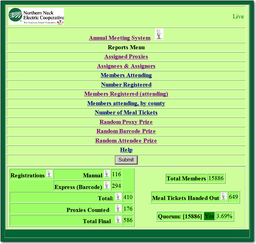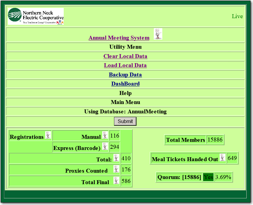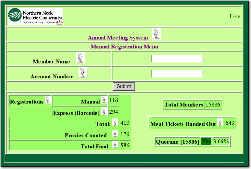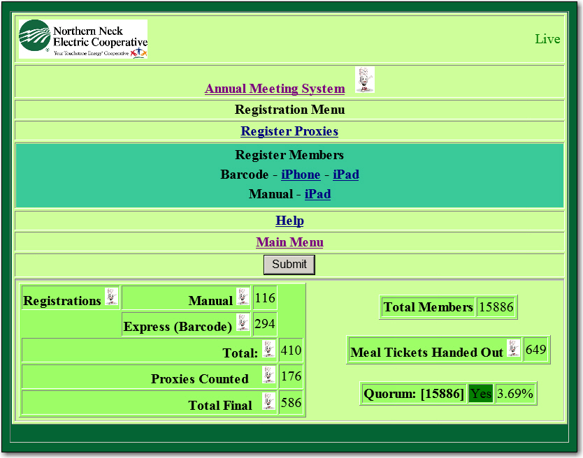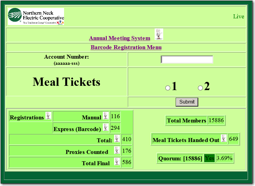 I decided to create a web based system to process the registrations, using iPhones and iPads. We ordered some bluetooth scanners to facilitate scanning barcoded bills. In anticipation of this, I had our bill print vendor add the account & Sub-account number to our members bills. When the barcode scanners came, they appeared a little cumbersome, so we then found the "iCody" app, which uses the internal camera as a barcode scanner and inputs the scan into a web form. It is perfect!