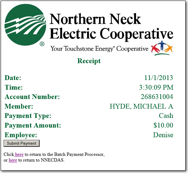 After the payment information is collected, a page appears, showing the member name (Puled from the CIS system) so the CSR can verify that they are postingto the right account. The page is formated so it could be printed as a receipt. Once the "Submit Payment" is clicked, the payment is save to the database.