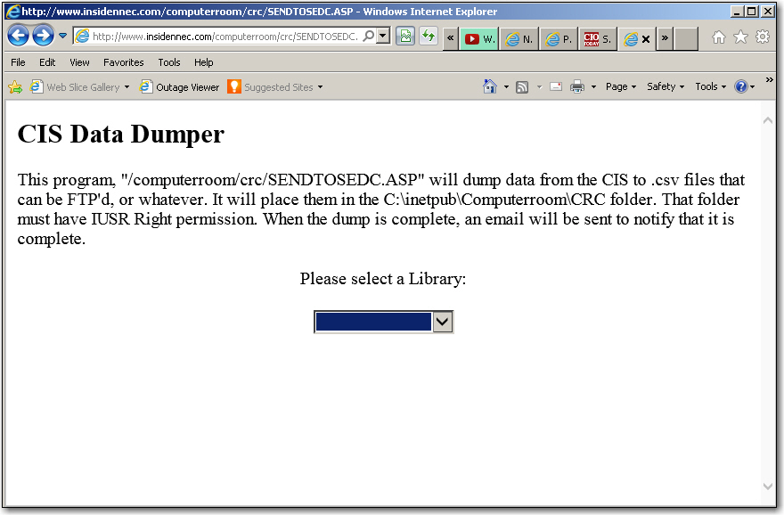 This program was written to make it easier to do routine data dumps from our current CIS system, Daffron, into .".csv" formatted files. The drop-down list will list the current supported libraries: